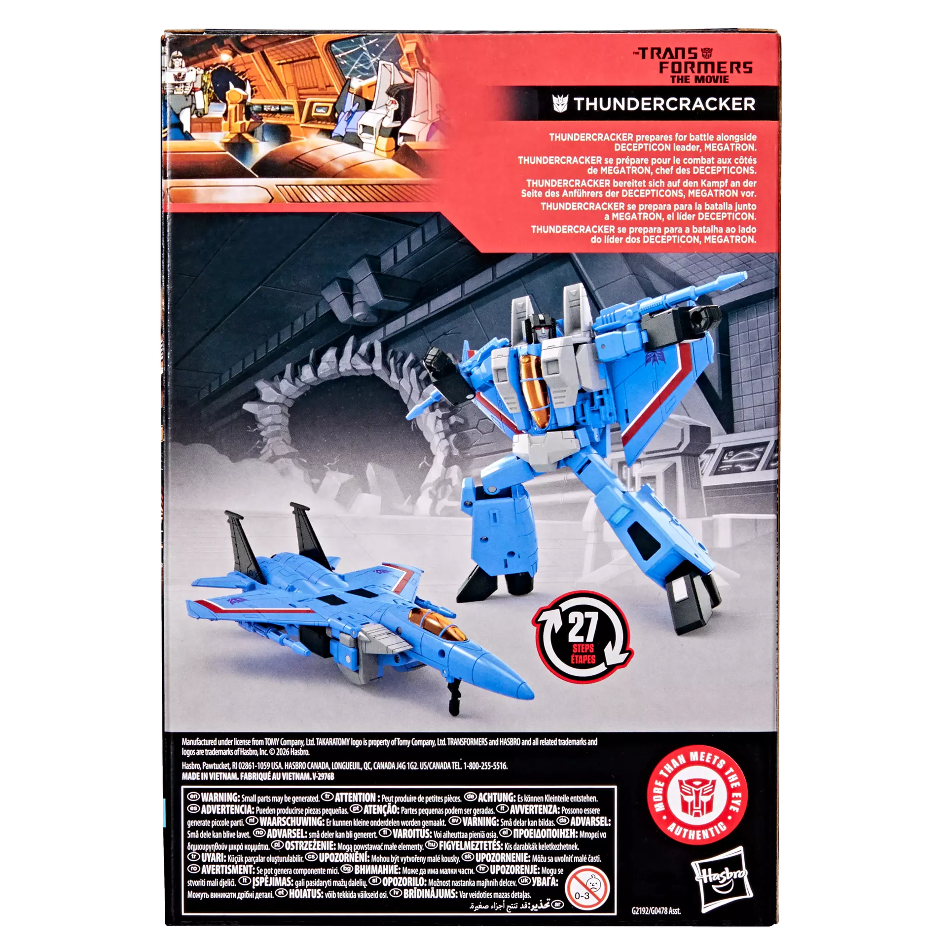The 6.5-inch (16.5 cm) figure converts from robot action figure to jet mode in 27 steps. With movie-inspired details, intricate poseability, and blaster accessories that attach in both modes, this Transformers Thundercracker action figure makes an awesome addition to any collection.